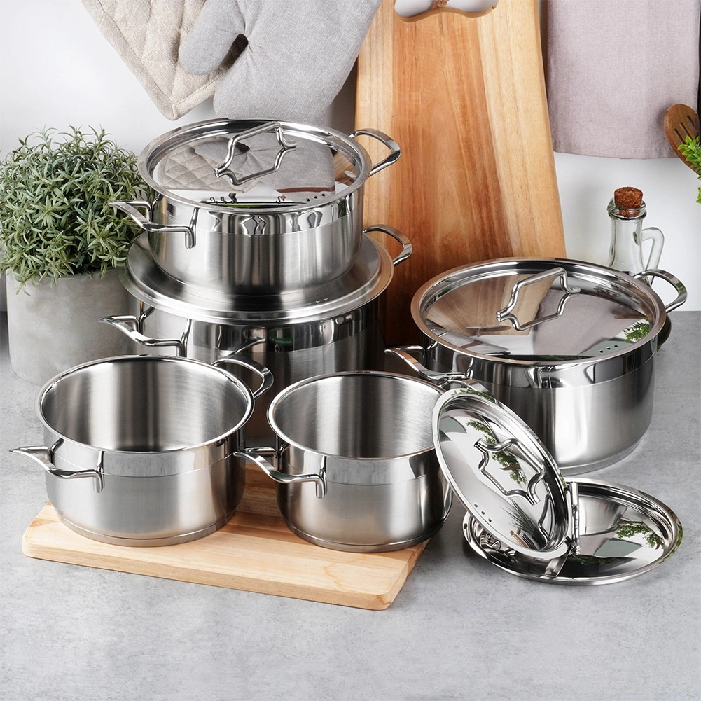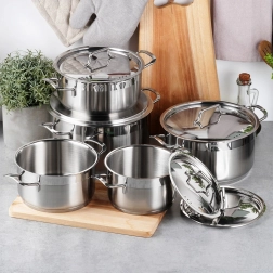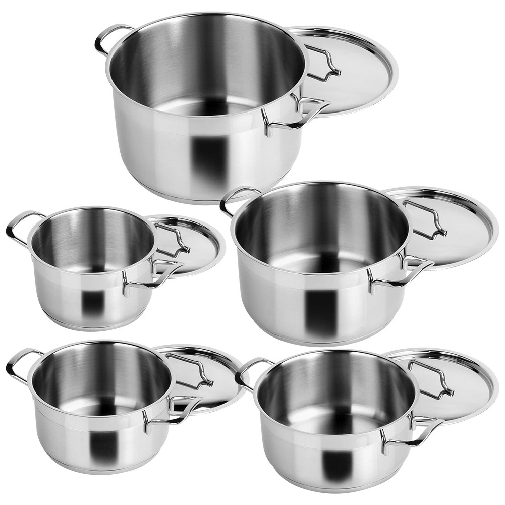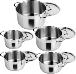 De ANETT-set biedt 10 delen – vijf pannen met perfect passende rvs deksels – in de meest populaire maten voor dagelijks koken, stoven en het bereiden van sauzen en soepen. Hoogwaardig roestvrij staal 304 (18/10) met een matte afwerking en elegante glanzende rand zorgt voor duurzaamheid, hygiëne en een tijdloze uitstraling in elke keuken.