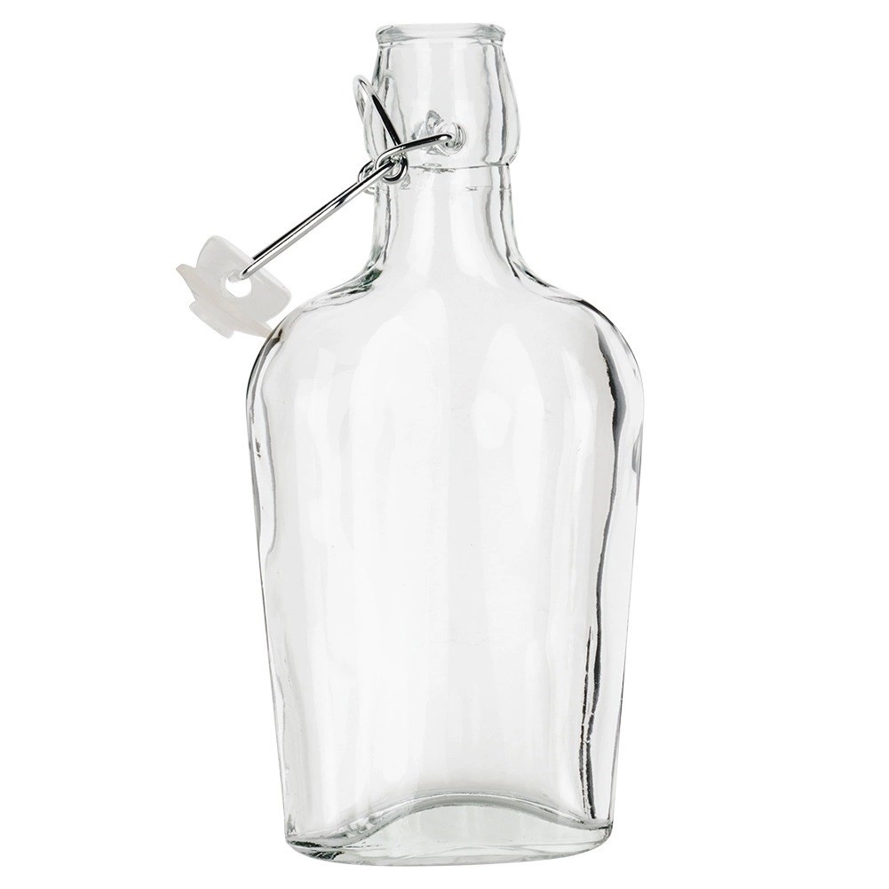 Praktische glazen fles met een inhoud van 180 ml en een klem-/beugelsluiting voor veilige en stijlvolle opslag van dranken. Ideaal voor huisgemaakte wijnen, likeuren, siropen en bier. Stevig, dik glas laat de inhoud mooi uitkomen, terwijl de afdichtende clipsluiting lekken voorkomt en de versheid verlengt. Afmetingen van de fles: 9 × 4 × 20 cm.