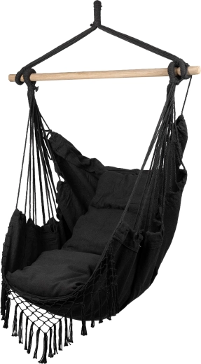 Geniet maximaal van ontspanning met de stijlvolle hangende Braziliaanse stoel in donkergrijs. Het comfort wordt gewaarborgd door twee kussens en een zachte hoofdsteun, terwijl de stevige houten dwarslat voor stabiliteit zorgt. De duurzame mix van 65% katoen en 35% polyester is aangenaam aanvoelend en tegelijkertijd slijtvast. Praktische zijvakken houden alles wat u nodig heeft binnen handbereik.