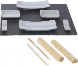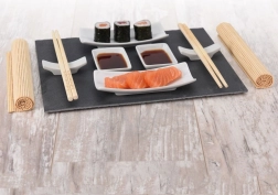 Dankzij de doordachte samenstelling zet je moeiteloos een diner voor twee op tafel: comfortabele eetstokjes met ruststeuntjes, sausbakjes, compacte rolmatjes en een stenen plank voor het serveren van sushi en sashimi. Ideaal voor dagelijks gebruik, feestjes en Japanse avonden.
