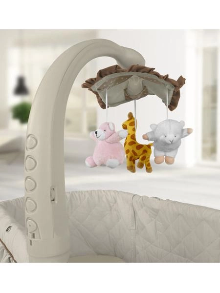 De geïntegreerde mobiel met pluchen diertjes biedt melodieën, een nachtlampje met instelbare helderheid en een trilfunctie voor snel in slaap vallen. Bediening is eenvoudig, ook op afstand, dankzij de meegeleverde afstandsbediening.