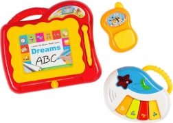De telefoon met klikgeluid en het uitwisbare tekentablet zijn eenvoudig los te halen en vast te houden – ideaal om ook onderweg mee te spelen.