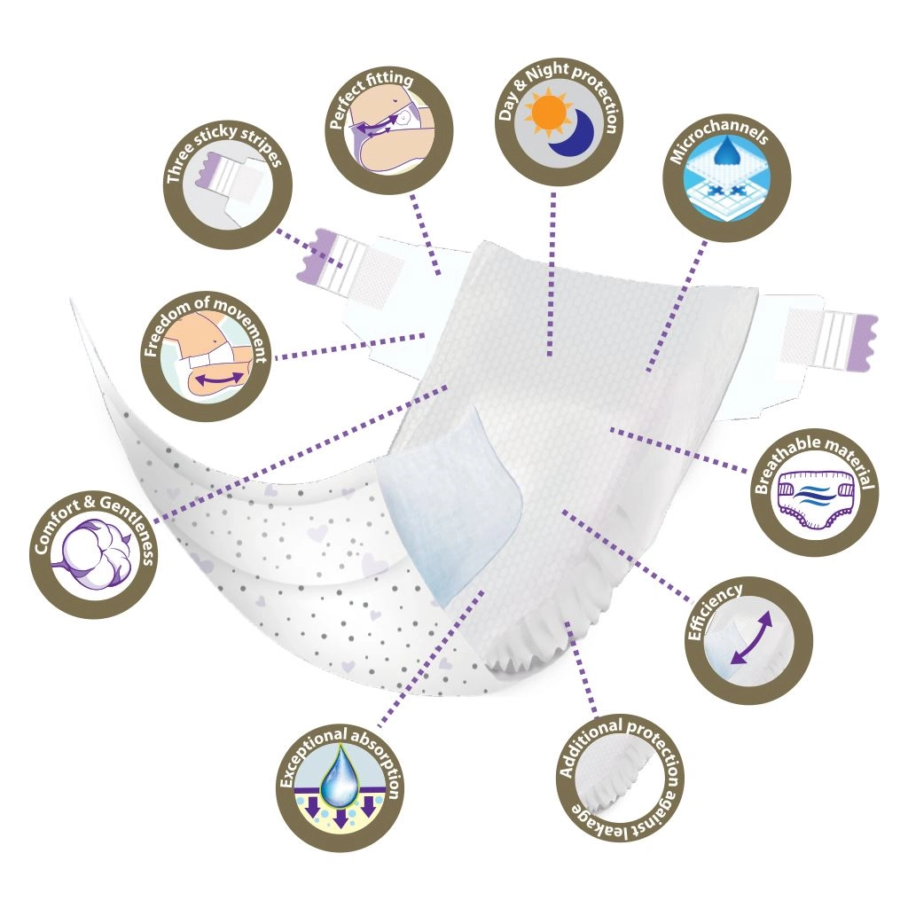 Zijdezachte New Love Premium Comfort luiers in maat MIDI 4–9 kg bieden je baby langdurige droogheid tot 12 uur, uitzonderlijke ademendheid en zachtheid voor de gevoelige huid. Dankzij microkanaaltjes en een superabsorberende kern met microparels voeren ze snel vocht af en voorkomen ze doorlekken, terwijl zachte en elastische randen bewegingsvrijheid en een comfortabele pasvorm garanderen.
