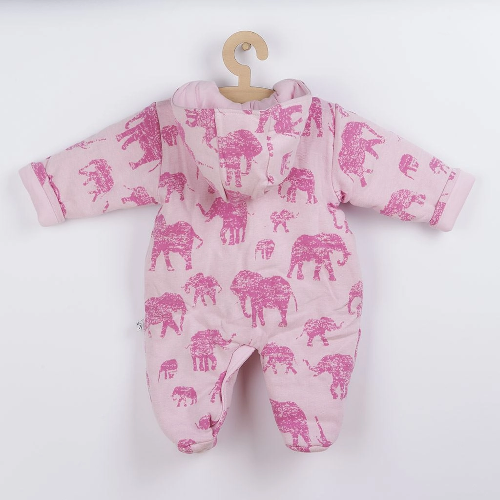 Deze gevoerde babyoverall is ideaal voor koelere dagen. Het aangename materiaal met katoenen voering zorgt voor een zachte aanraking met de babyhuid, terwijl de antiallergene vulling betrouwbare warmte biedt zonder irritatie. De schattige olifantenprint en de roze uitvoering zullen elke liefhebber van een zacht design bekoren.
