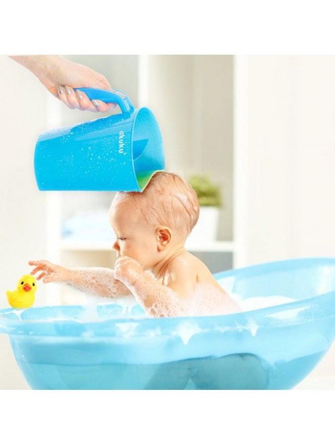 De AKUKU-kan in wit‑mint is een slimme helper voor het dagelijks baden van baby’s en grotere kinderen. De zachte, meebuigende rand sluit zacht aan op het voorhoofd en leidt de waterstroom zo dat deze niet in de ogen komt. Twee gescheiden kamers maken gecontroleerd schenken en gelijkmatig uitspoelen van shampoo en schuim mogelijk.