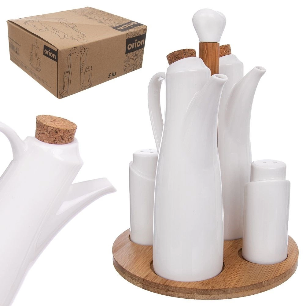 Deze 5-delige porseleinen set is ideaal voor dagelijks dineren en feestelijk serveren. Hij combineert een strak wit design met natuurlijk bamboe en brengt orde en stijl in je keuken. Dankzij de kurken stoppen blijven je oliën en azijnen langer vers en het porselein kan zonder zorgen in de vaatwasser.