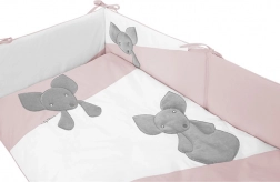 Deze elegante set voor het babybedje combineert luchtige materialen met een zacht design dat in iedere kamer past. Roze-witte panelen worden aangevuld met grijze dierenapplicaties die een rustgevende sfeer creëren en een goede nachtrust voor je baby ondersteunen.