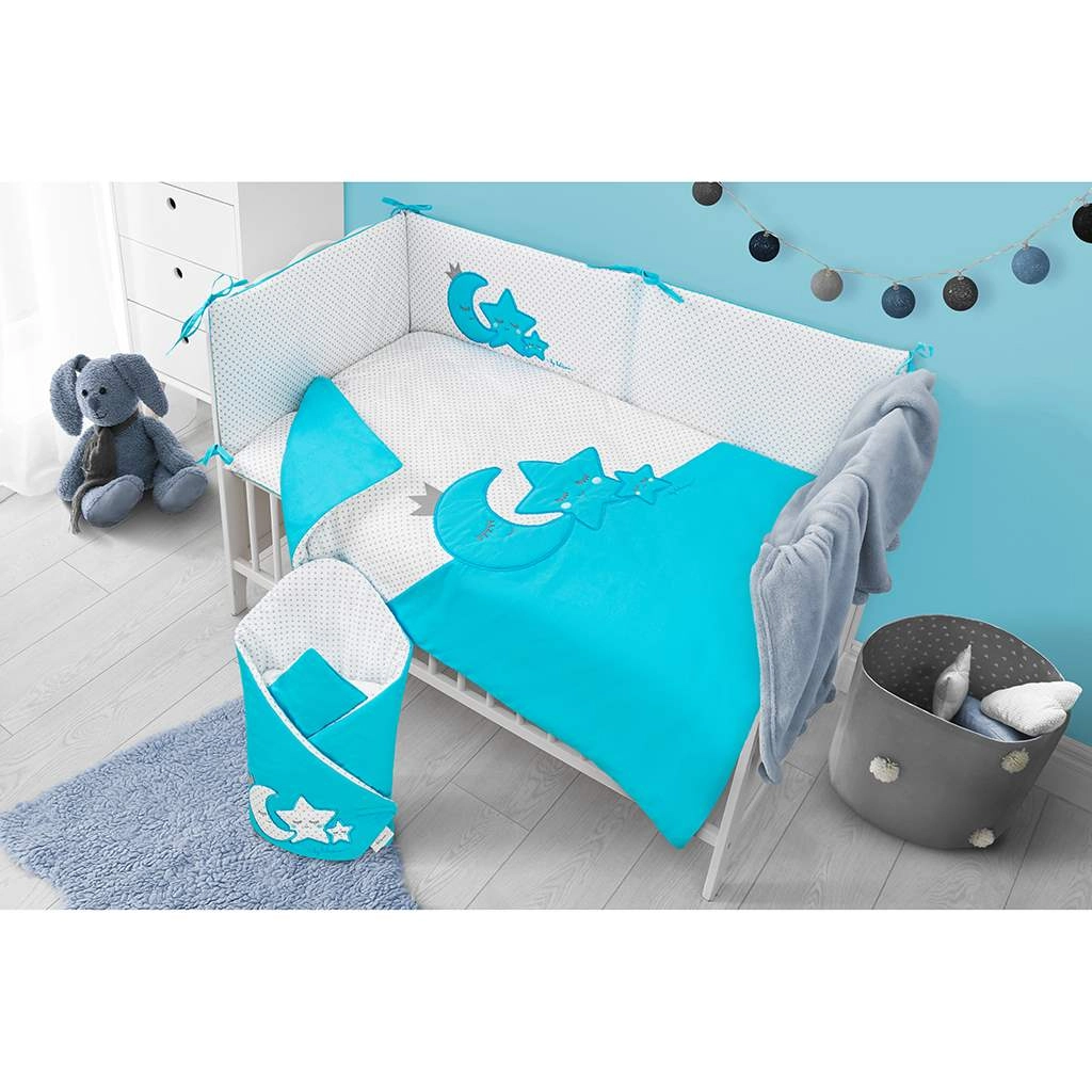 De zachte BELISIMA Magic Stars babybedset in turkooiskleur biedt comfort, veiligheid en een rustige slaap voor je kleintje. Bevat beddengoed 40 × 60 en 100 × 135 cm, een bedbumper, vullingen voor kussen en dekbed en een hemel. Gemaakt van 100% katoen met een hypoallergene vulling, veilige ritsen zonder los bungelende runners, zonder knopen en harde onderdelen.