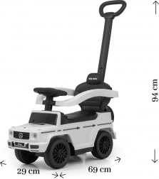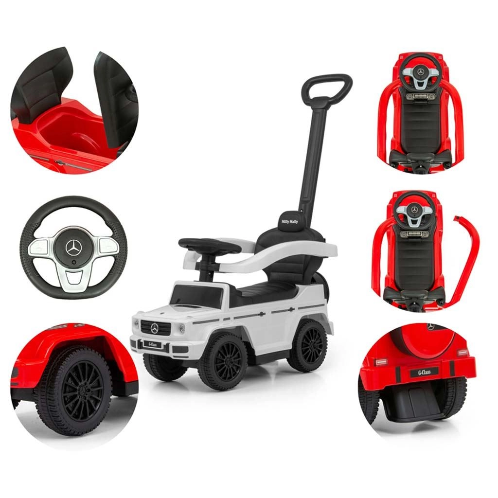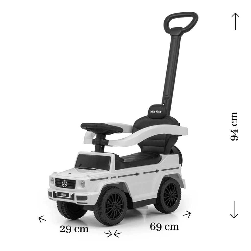 Stijlvolle kinderloopauto met officiële MERCEDES-licentie, geïnspireerd op de G‑Class, voor een veilige rit en veel plezier voor kinderen van 12 tot 36 maanden. Voorzien van een duwstang voor ouders, zwenkende voorwielen, een brede zitting met opbergruimte en geluidseffecten op het stuur. Dankzij de afneembare zijsteunen, voetensteunen en stang verandert hij eenvoudig van begeleide loopauto in een zelfstandig loopvoertuig.