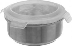 Deze robuuste ronde voedselbox combineert een stevige rvs kom met een transparant deksel en rubberen afdichting. Vier stevige clips zorgen voor een veilige, lekdichte sluiting, waardoor hij perfect is voor sauzen, salades en snacks. Roestvrij staal is duurzaam en hygiënisch en neemt geen geuren op; de kom is vaatwasmachinebestendig (het deksel wordt handwas aanbevolen).
