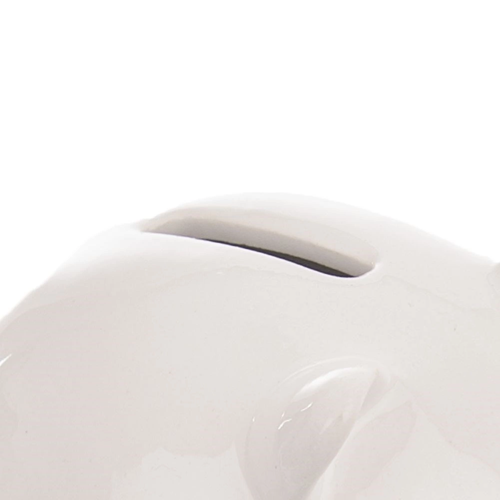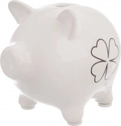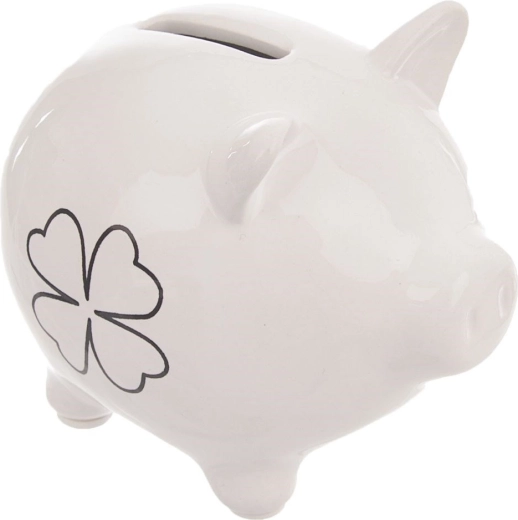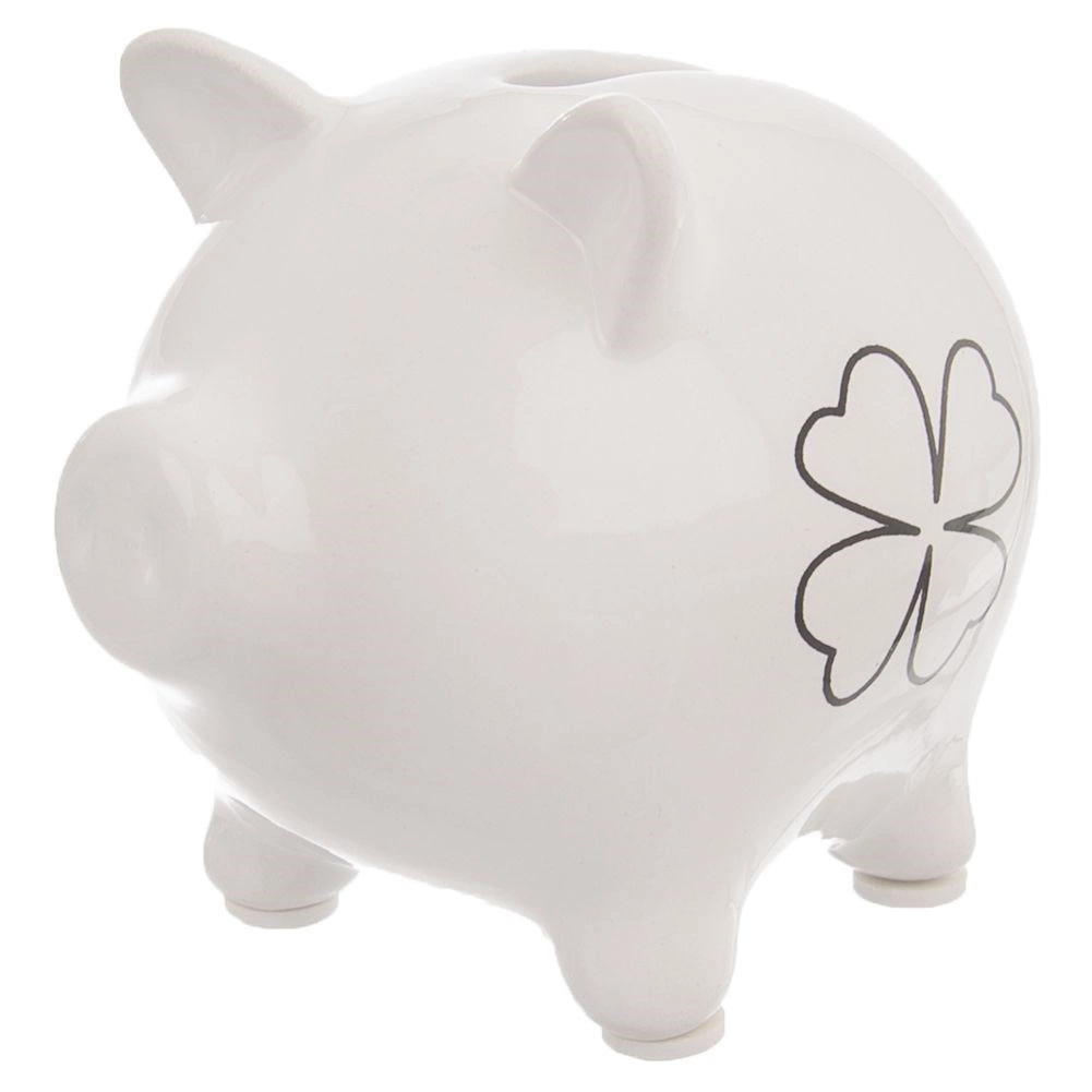 Minimalistische witte spaarpot in varkensvorm met een subtiele omlijning van een klaverblad, ideaal voor het dagelijks sparen van munten en bankbiljetten. Dankzij de stevige keramiek en de gladde glazuur oogt hij elegant en past perfect in de kinderkamer, het kantoor of de woonkamer.
