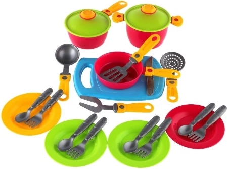 Speel kok met deze leuke set kinderservies met snijplank. Bevat alles wat kleine koks nodig hebben en is gemaakt van hoogwaardige en gezondheidsvriendelijke kunststof die bestand is tegen mechanische beschadiging. Ideaal voor de ontwikkeling van fantasie en fijne motoriek bij kinderen vanaf 3 jaar.