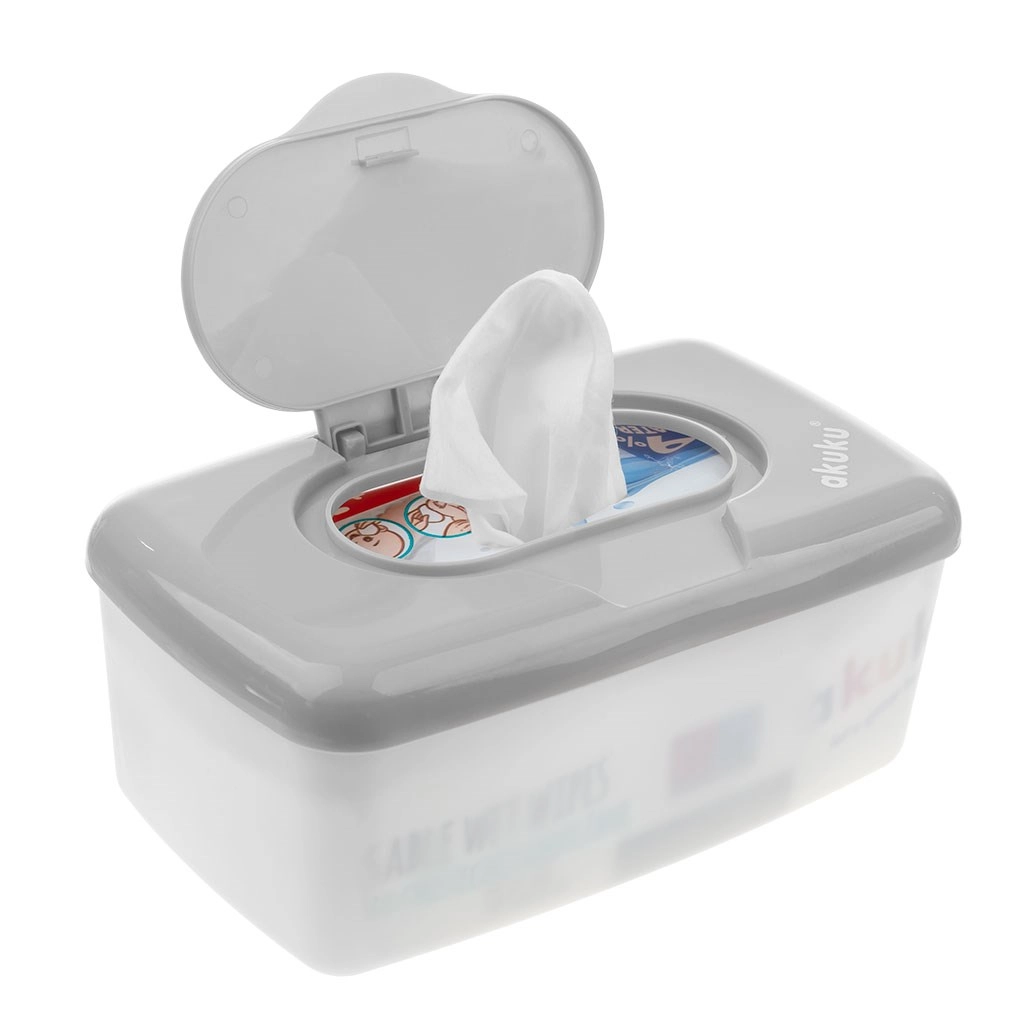 Praktische box voor vochtige doekjes van AKUKU in grijs houdt de doekjes zowel thuis als onderweg vers en niet uitgedroogd. Dankzij de compacte afmetingen past hij makkelijk in je tas, hij is licht en het deksel met een grote knop maakt openen met één hand mogelijk.