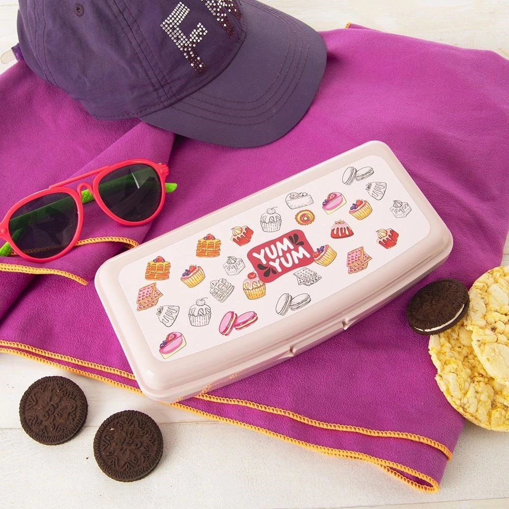 De vrolijke print met desserts en de tekst YUM YUM spreekt kinderen aan en helpt hen hun box makkelijk te herkennen.