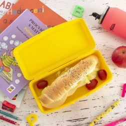 Praktische lunchbox met een inhoud van 500 ml in een moderne gele kleur, ideaal voor canapés, snacks en kleine spulletjes. Hij heeft een veilig klikdeksel met één clip, is licht, makkelijk schoon te maken en dankzij het schoolmotief herkennen kinderen hem direct. Geschikt voor school, uitstapjes en reizen.