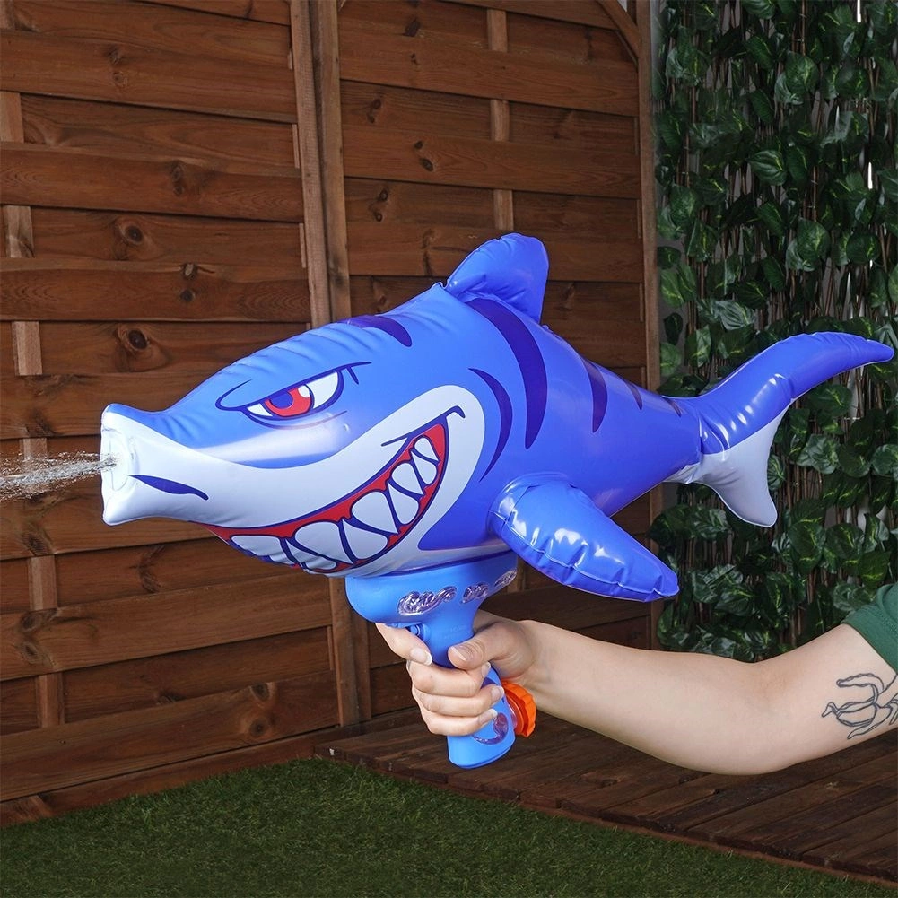 Het opblaasbare waterpistool in de vorm van een haai bezorgt kinderen plezier op het strand, bij het zwembad en in de tuin. Met de meegeleverde pomp blaas je hem in een mum van tijd op, en na het spelen laat je de lucht eruit voor eenvoudig opbergen en meenemen. De duurzame uitvoering van hoogwaardige kunststof zorgt voor urenlang zorgeloos speelplezier.