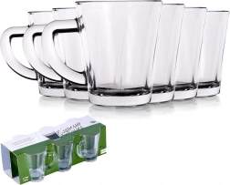 Stijlvolle set van zes glazen espressokopjes met een inhoud van 70 ml, perfect voor alle koffieliefhebbers. Gemaakt van duurzaam, helder glas met een comfortabel oor voor een veilige grip. Dikke wanden, klassiek design en eenvoudig te reinigen in de vaatwasser maken deze glazen een praktische keuze voor thuis en horeca.
