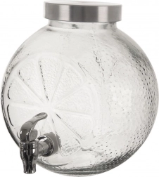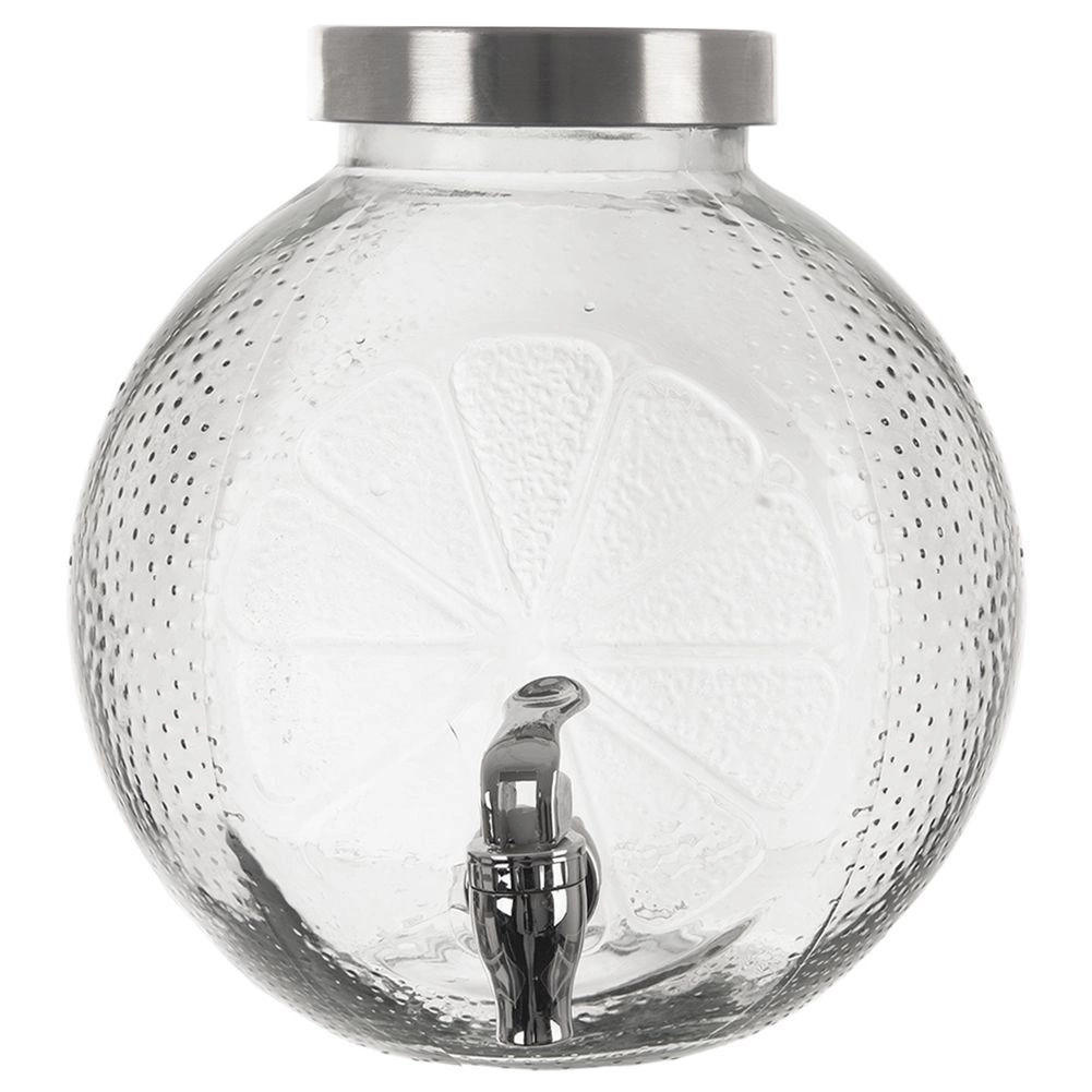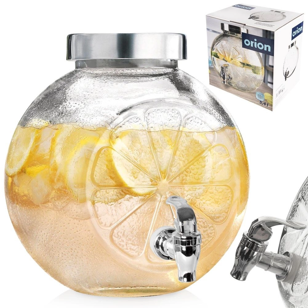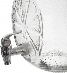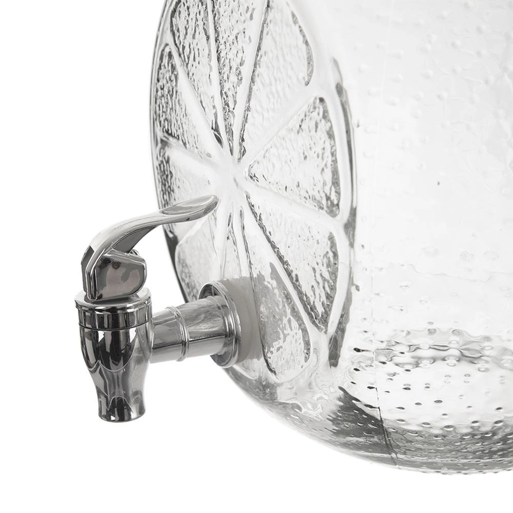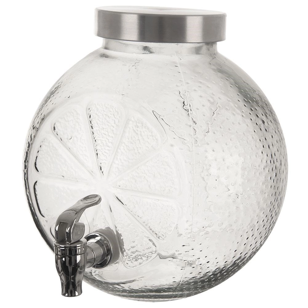 Stijlvolle glazen drankdispenser met een inhoud van 5,4 l, metalen deksel en een praktisch kraantje. Ideaal voor limonades, sappen en huisgemaakte ijsthee. Stevig helder glas met decoratief citrusreliëf, een brede opening voor eenvoudig vullen en een deksel tegen insecten maken het de perfecte keuze voor tuinfeesten en serveren thuis.