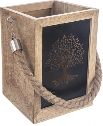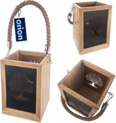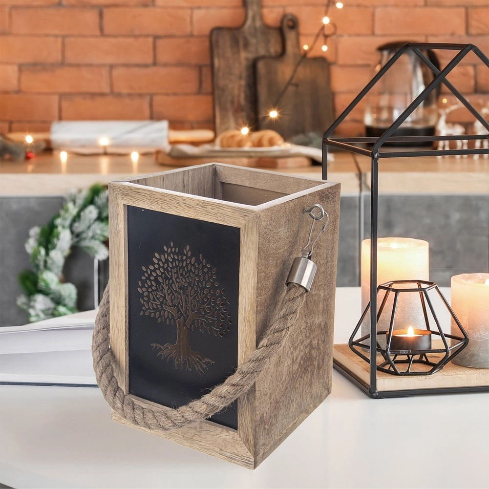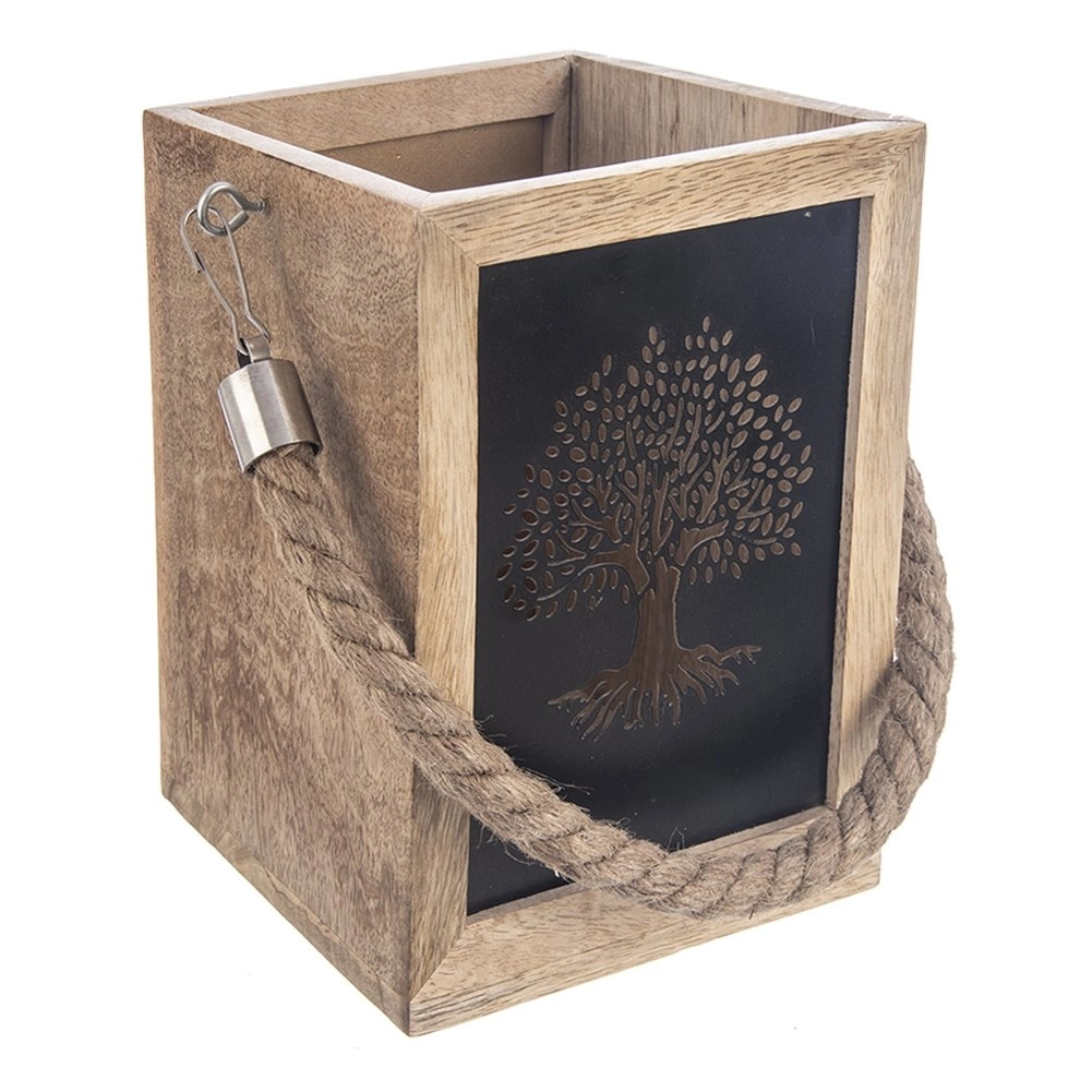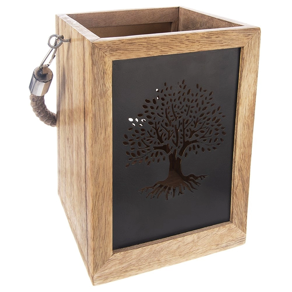 De smaakvolle lantaarn van exotisch mangohout betovert met een natuurlijke uitstraling en warm licht dat door de metalen panelen met boomuitsnede schijnt. Een praktische interne uitsparing vergemakkelijkt het plaatsen van een kaars of een glazen inzet. Dankzij de robuuste koordhandgreep is de lantaarn geschikt om neer te zetten of op te hangen.