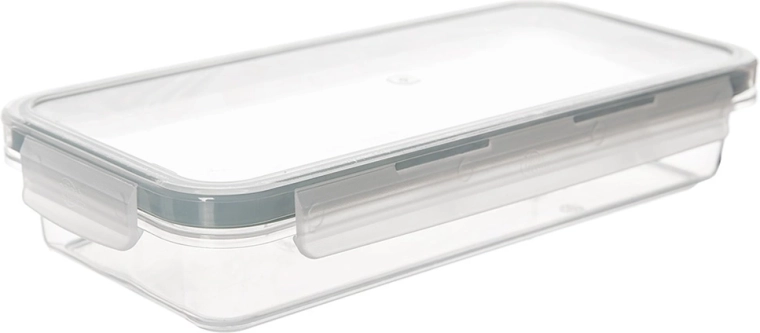 Universele lage voedseldoos van duurzaam, transparant plastic voor bewaren, vervoeren en organiseren van maaltijden. Dankzij het stevige deksel met 4 clips en de hoogwaardige siliconen afdichting blijft de inhoud beschermd tegen lucht en vocht, zodat voedsel langer vers blijft.