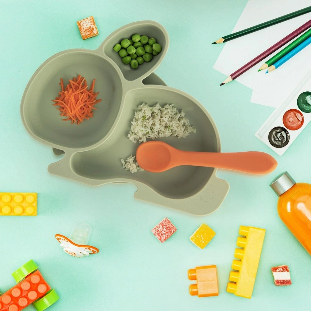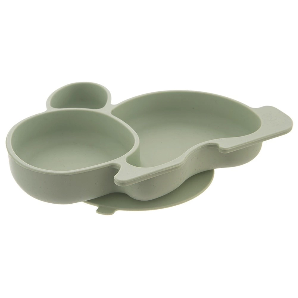 Het siliconen kinderbord met drie gescheiden vakken helpt gevarieerde porties te serveren en de afzonderlijke onderdelen van de maaltijd gescheiden te houden. De grote en krachtige zuignap aan de onderzijde minimaliseert schuiven en omstoten, ideaal om zelfstandig eten aan te leren.