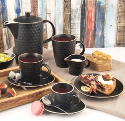 Hoogwaardig steengoed in mat zwart met honingraatreliëf garandeert een lange levensduur en een veilige grip.