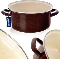 Praktische geëmailleerde pan met een inhoud van 4 l en een diameter van 24 cm in een elegante bruine kleur met beige binnenzijde. Gemaakt van staal met een hoogwaardige geëmailleerde afwerking, geschikt voor alle soorten kookplaten, inclusief inductie, en ook voor in de oven. Gemakkelijk schoon te maken, geschikt voor de vaatwasser en dankzij de stevig geniete handgrepen veilig te verplaatsen. Stijlvol retrodesign uit de Brown-collectie van het merk ORION.