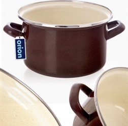 Stijlvolle geëmailleerde pan met een inhoud van 2 l en een diameter van 18 cm, ideaal voor het koken en stoven van alledaagse gerechten. Gemaakt van staal met een hoogwaardige, gezondheidsvriendelijke emaillaag, geschikt voor alle soorten kookplaten, inclusief inductie, en voor gebruik in de oven. Voorzien van comfortabele, robuuste handgrepen, eenvoudig te reinigen en vaatwasmachinebestendig. De elegante bruine buitenkant en crèmekleurige binnen-emaillering worden aangevuld met een roestvrijstalen rand voor extra duurzaamheid.