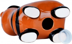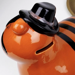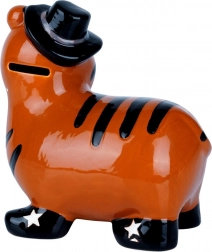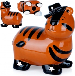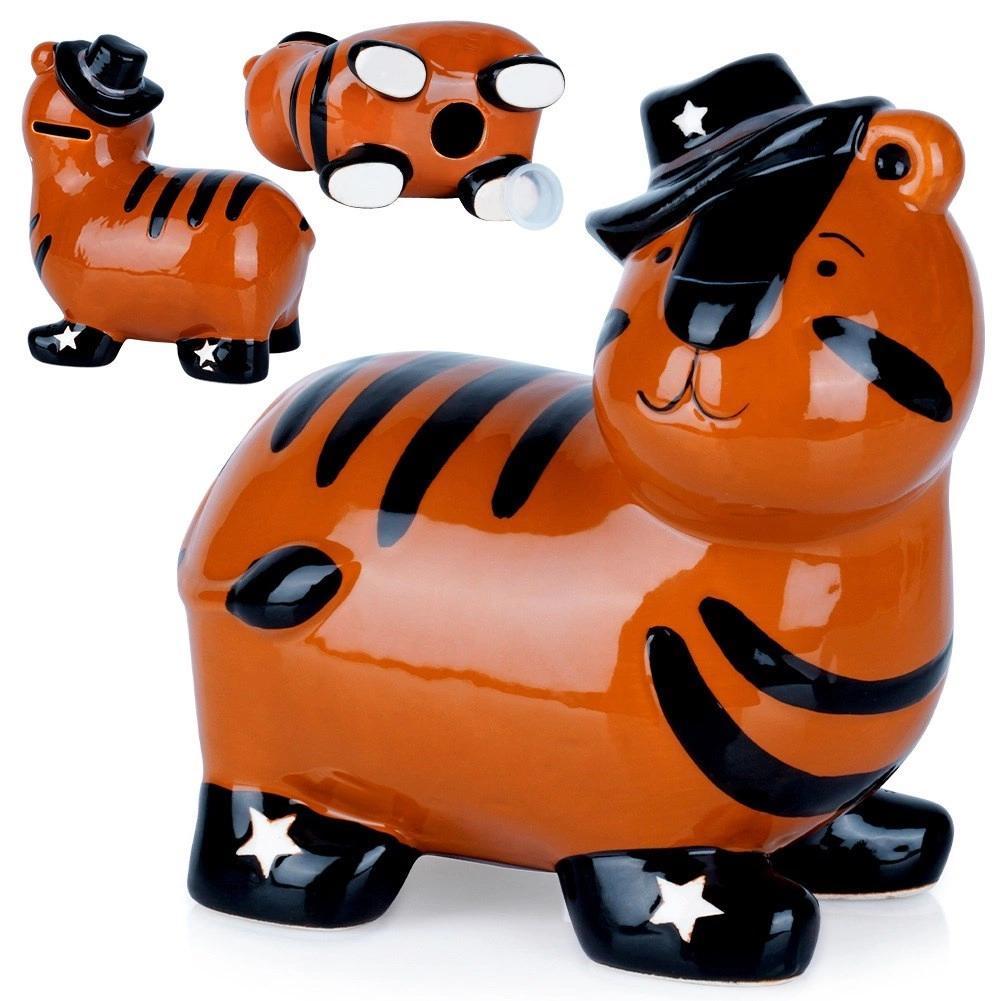 Deze keramische spaarpot in de vorm van een tijger combineert functionaliteit met een decoratieve uitstraling. Het glanzende oranje oppervlak met zwarte strepen, hoed en sterren op de schoentjes geeft een speels karakter dat zowel een kinderkamer als een modern interieur opvrolijkt. Dankzij de opening aan de onderkant met uitneembare stop kun je het spaargeld herhaaldelijk uitnemen zonder te breken.