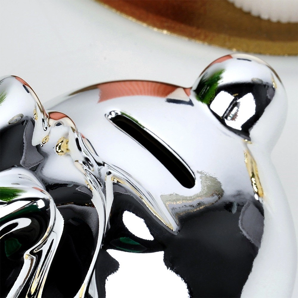 De hoogglanzende, chroomachtige afwerking verandert de spaarpot in een opvallende decoratie die schittert op een plank of bureau.