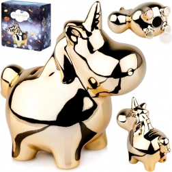 De elegante gouden spaarpot in de vorm van een eenhoorn is zowel decoratie als een praktische hulp voor dagelijks sparen. Dankzij de glanzende spiegelafwerking geeft hij de ruimte een vleugje luxe en wordt hij een opvallend accent op de plank, het bureau of in de kinderkamer.