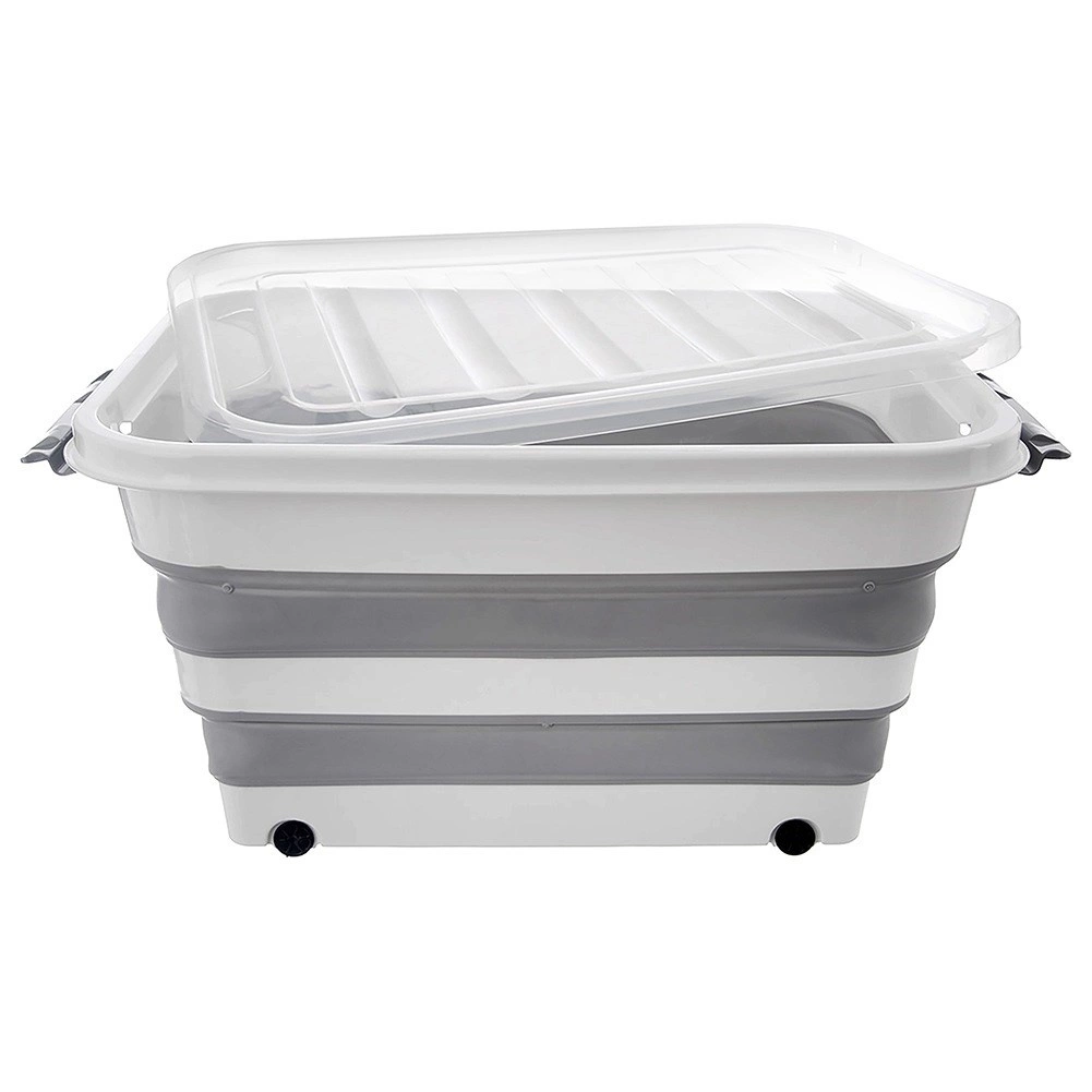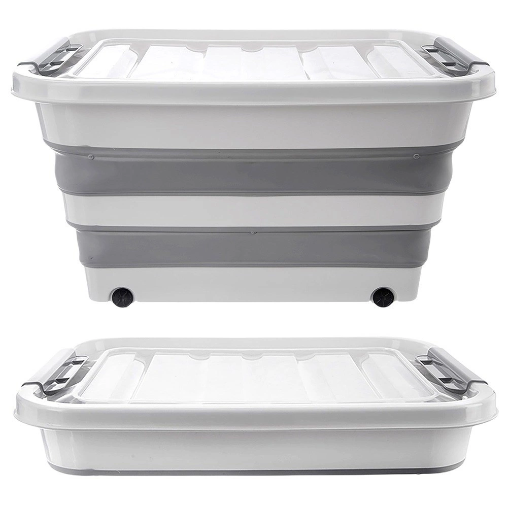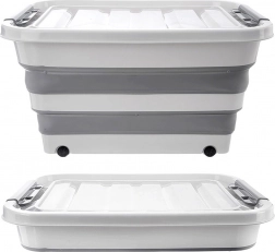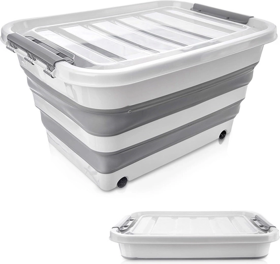 Praktische opvouwbare opbergbox van 30 l met wieltjes en een transparant deksel voor eenvoudige organisatie in huis. Dankzij de opvouwbare constructie bespaart hij ruimte, heeft hij stevige dekselsluitingen en is hij gemaakt van duurzame materialen. Geschikt voor textiel, speelgoed, kleding en boeken. Mobiel dankzij wieltjes, opvouwbaar design, veilige sluiting en universeel gebruik.
