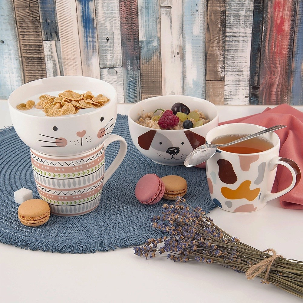 Geniet van stijlvol serveren bij het ontbijt. Deze porseleinen set met een schattig kattengezicht combineert mok en kom tot een speels geheel – leuk voor kinderen en volwassenen. Hoogwaardig porselein met een gladde, glanzende glazuur voelt prettig aan, is duurzaam voor dagelijks gebruik en gemakkelijk schoon te houden.