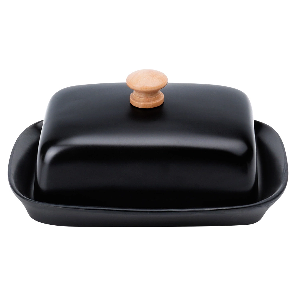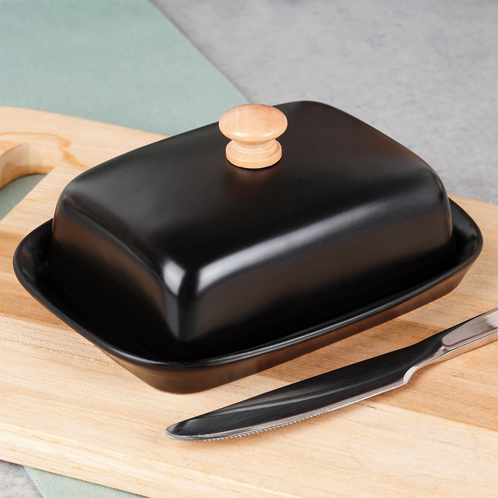 Deze stijlvolle botervloot van hoogwaardige keramiek in zwarte uitvoering is ideaal voor dagelijks gebruik thuis en voor serveren aan tafel. De houten greep op het deksel zorgt voor comfortabel optillen, terwijl de nauwsluitende kap de boter beschermt tegen uitdrogen en vreemde geuren.