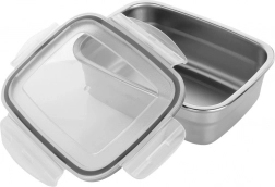 Compacte RVS voedselcontainer van 500 ml met transparant deksel, vier clips en siliconenafdichting voor een perfect luchtdichte en lekkagevrije afsluiting. Ideaal voor lunch, tussendoortjes en restjes – thuis, op het werk en onderweg. Duurzaam roestvrij staal houdt de temperatuur beter vast en het deksel maakt snelle inhoudscontrole mogelijk.