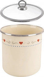 Stijlvolle keukendoos met een inhoud van 1,4 l van geëmailleerd staal in crèmekleur met hartjes en een transparant glazen deksel houdt voedsel langer vers. Ideaal voor meel, suiker, koffie, thee en droge levensmiddelen. Dankzij de roestvrijstalen rand is hij duurzaam en eenvoudig te reinigen, bovendien geschikt voor de vaatwasser.