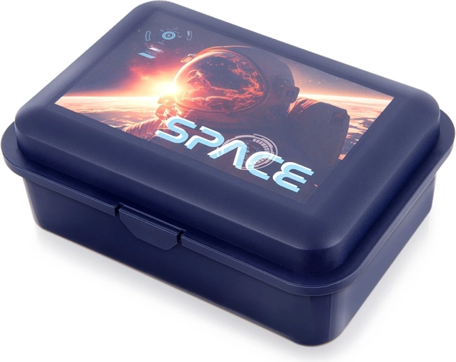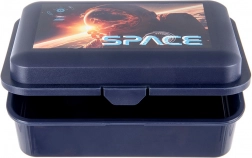 Stijlvolle en duurzame lunchbox met een opvallend ruimtemotief en de tekst SPACE, aantrekkelijk voor zowel kinderen als volwassenen. Eenvoudige enkelvoudige kamer en rechthoekige vorm bieden voldoende ruimte voor sandwiches, fruit of andere lekkernijen. De box is licht, gemaakt van voedselveilige materialen die neutraal zijn voor smaak en geur, en voldoet aan de Europese normen.