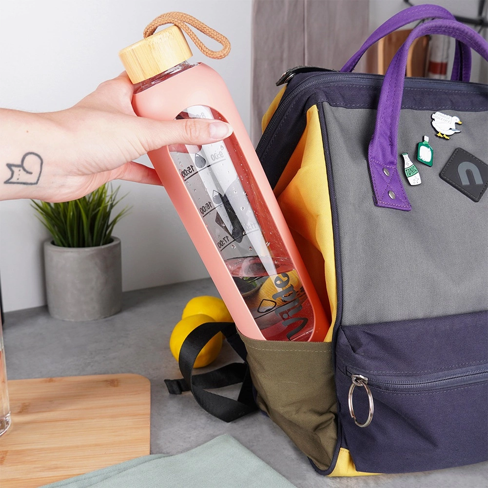 Blijf gehydrateerd in stijl. Deze zalmroze fles combineert elegant design met functionaliteit: duurzaam borosilicaatglas, een veilige bamboe dop met textiell lus en een siliconen hoes voor een zekere grip en bescherming tegen breuk. Dankzij de tijdmarkeringen volg je je waterinname eenvoudig de hele dag door.
