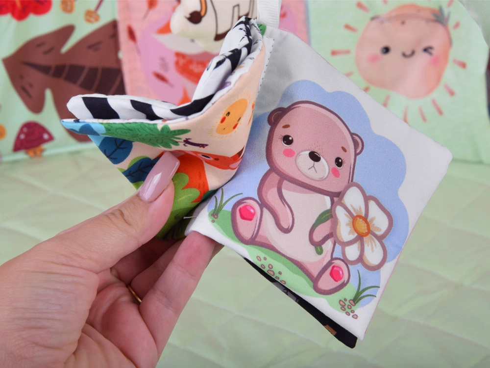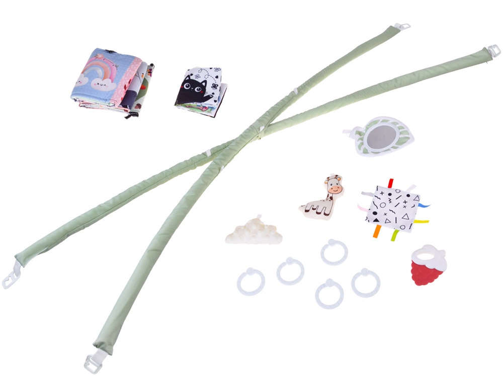 Inclusief een uitgebreide set accessoires: een pluche giraffe, een zacht wolkje, een bijtring, een veilig spiegeltje, een knisperend vierkant met labeltjes en contrasterende stoffen boekjes. Zo “groeit” de mat met het kind mee – van kijken boven het hoofd, via tummy time, tot de eerste omrolpogingen en zitten.