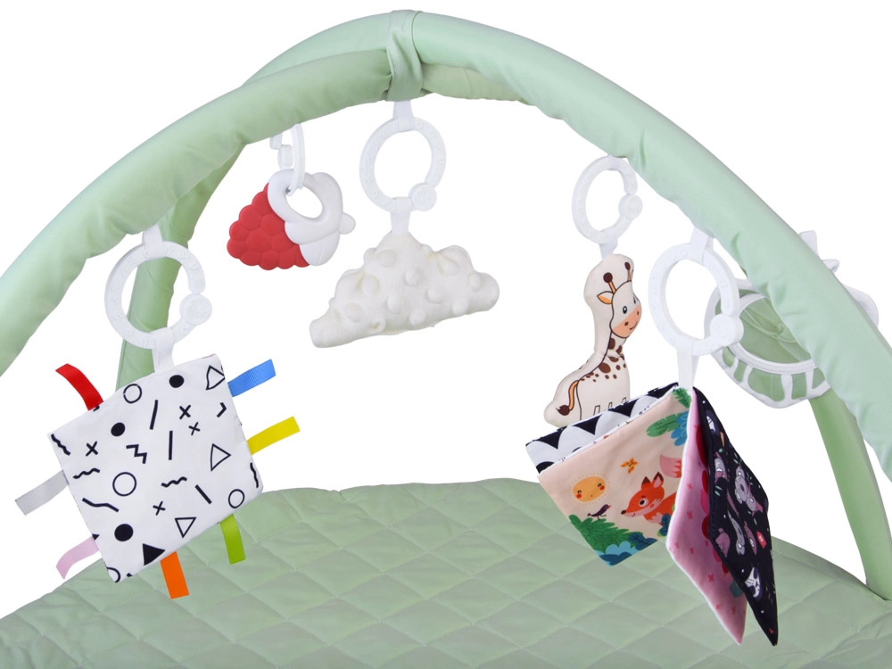Twee flexibele bogen zijn eenvoudig los te maken voor het wassen of reizen. De opgehangen speeltjes – bijtring, wolkje, giraffe en knisperende vierkantjes – motiveren om te reiken en stimuleren de zintuigen.