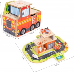 De doordachte opvouwbare 2-in-1 constructie laat kinderen spelen in een ruime kazerne die je na afloop eenvoudig sluit tot een brandweerwagen – ideaal om op te bergen en mee te nemen. De kazerne met twee verdiepingen, garage, helihaven en thematische details nodigt uit tot realistisch rollenspel als hulpverlener.