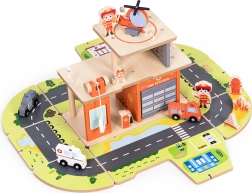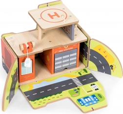 Garage, glijbaan, landingsplaats op het dak en bedrukte wegen inspireren tot gevarieerd spel rond reddingsacties.