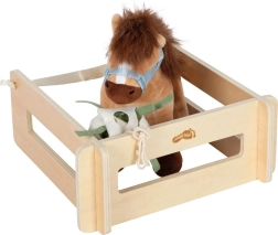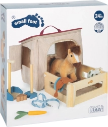 Deze gedetailleerde small foot speelset geeft kinderen alles wat ze nodig hebben voor de paardenwereld. De stevige corduroy tas verandert dankzij de ritsen in een praktische stal en opbergruimte voor accessoires. Voor de stal kun je een hekje met klittenband neerzetten of het als een cirkel sluiten als uitloop – het spel voelt realistisch en stimuleert vrij verhalen vertellen.