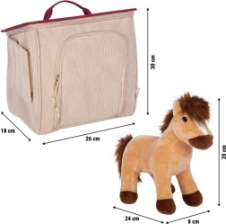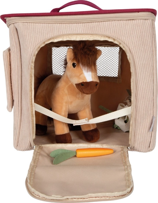 Schattig pluchen paardje in een praktische corduroy tas die met een rits verandert in een draagbare stal. De set bevat alles voor realistisch fokken en verzorgen: zadel, dekje, hoofdstel, hekje met klittenband, hooinet, worteltje en opruimgereedschap. Ideaal voor onderweg, stimuleert de verbeelding en fijne motoriek. Draagbare stal, rijke accessoires, creatief rollenspel.