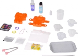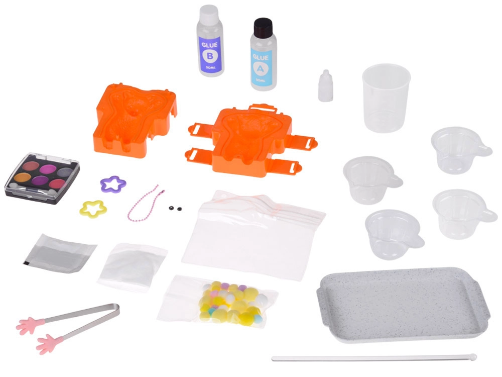 De set bevat een mal, tang, roerstaafje, maatbeker, 2× lijm, pigment, decoraties, handschoenen en ook een praktisch bakje en dienblad voor schoon werken. Een eenvoudige handleiding leidt kinderen stap voor stap – van het mengen van het materiaal tot de uiteindelijke decoratie en ophanging.
