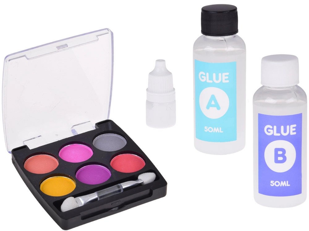 De set bevat een mal, tangetje, roerstaafje, lijmen, pigment, zachte bolletjes, sterretjes, oogjes, sierzakje, kettinkje en meer – je kunt meteen beginnen.