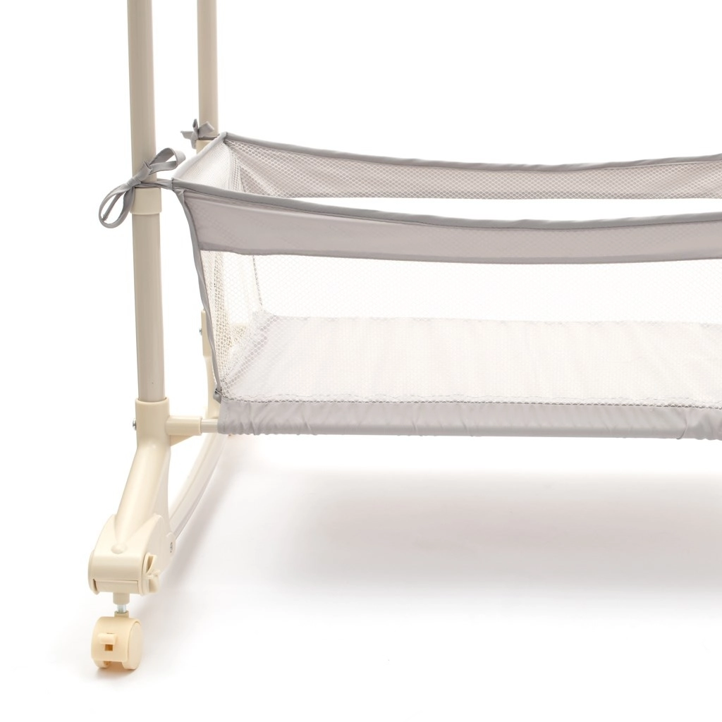 Onderdeel is een mobiel met kleurrijke diertjes, uitgerust met een nachtlampje, een geluidsmodule met 8 melodieën en zachte vibraties – alles met traploze regeling van intensiteit en volume. De praktische onderste mand houdt alle benodigdheden binnen handbereik en de verstevigde binnenvoering met vinyl matras zorgt voor hygiëne en eenvoudig onderhoud.