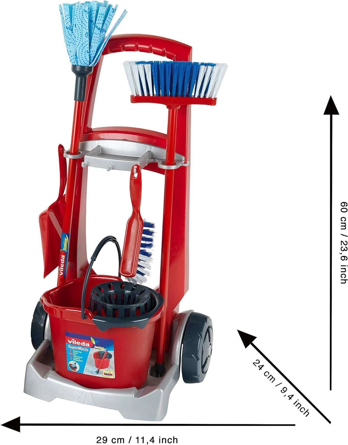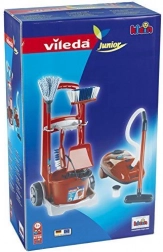 Een leuke en realistische set voor kleine helpers in huis: kinder schoonmaakkar met stofzuiger onder de licentie van VILEDA JUNIOR van KLEIN. Bevat een kar op wieltjes, mop, bezem, stoffer, blik, emmer met wringer en een functionele speelgoedstofzuiger met granulaat. Realistische details, duurzame afwerking en eenvoudige bediening stimuleren creatieve rollenspellen en het nadoen van volwassenen.