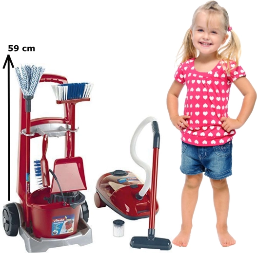 De set is ontworpen zodat kinderen het dagelijkse schoonmaken veilig kunnen nadoen. De robuuste kar in rood-grijze uitvoering met grote wielen is eenvoudig te bedienen en vervoert alle accessoires naar de juiste plek. De speelgoedstofzuiger in het rood heeft een transparante container en zuigt tijdens het spel het meegeleverde granulaat op, dat na het vullen eenvoudig kan worden geleegd – extra realistisch dankzij het stofzuiggeluid.