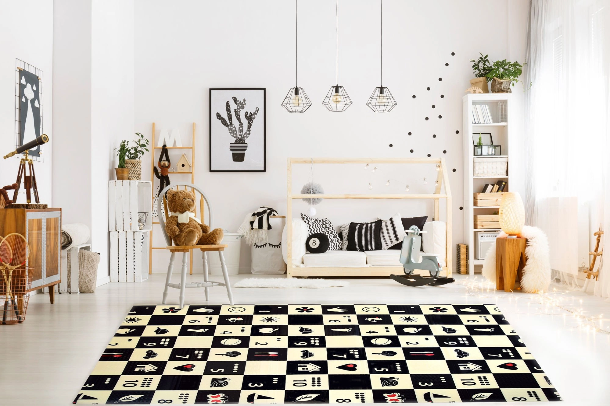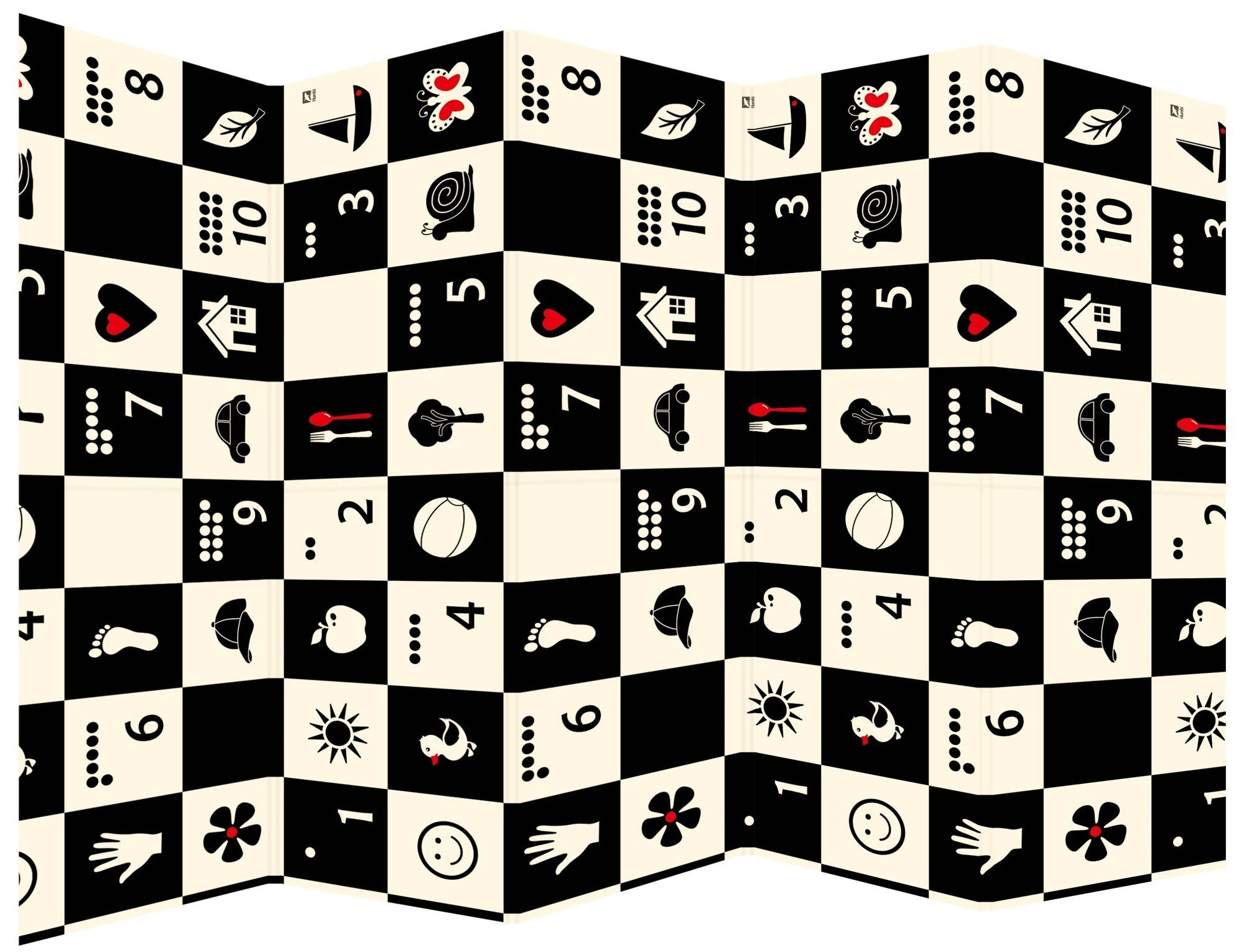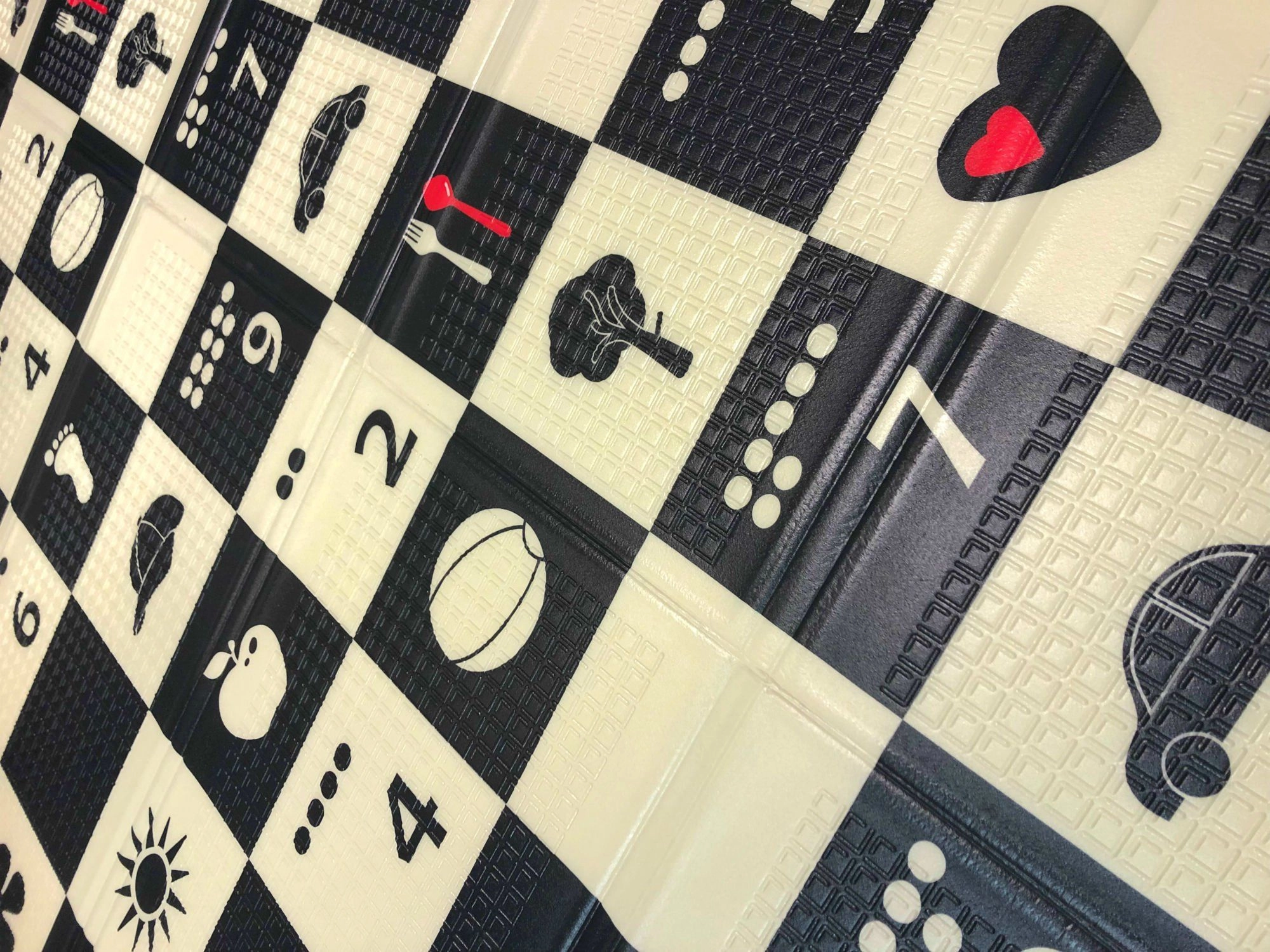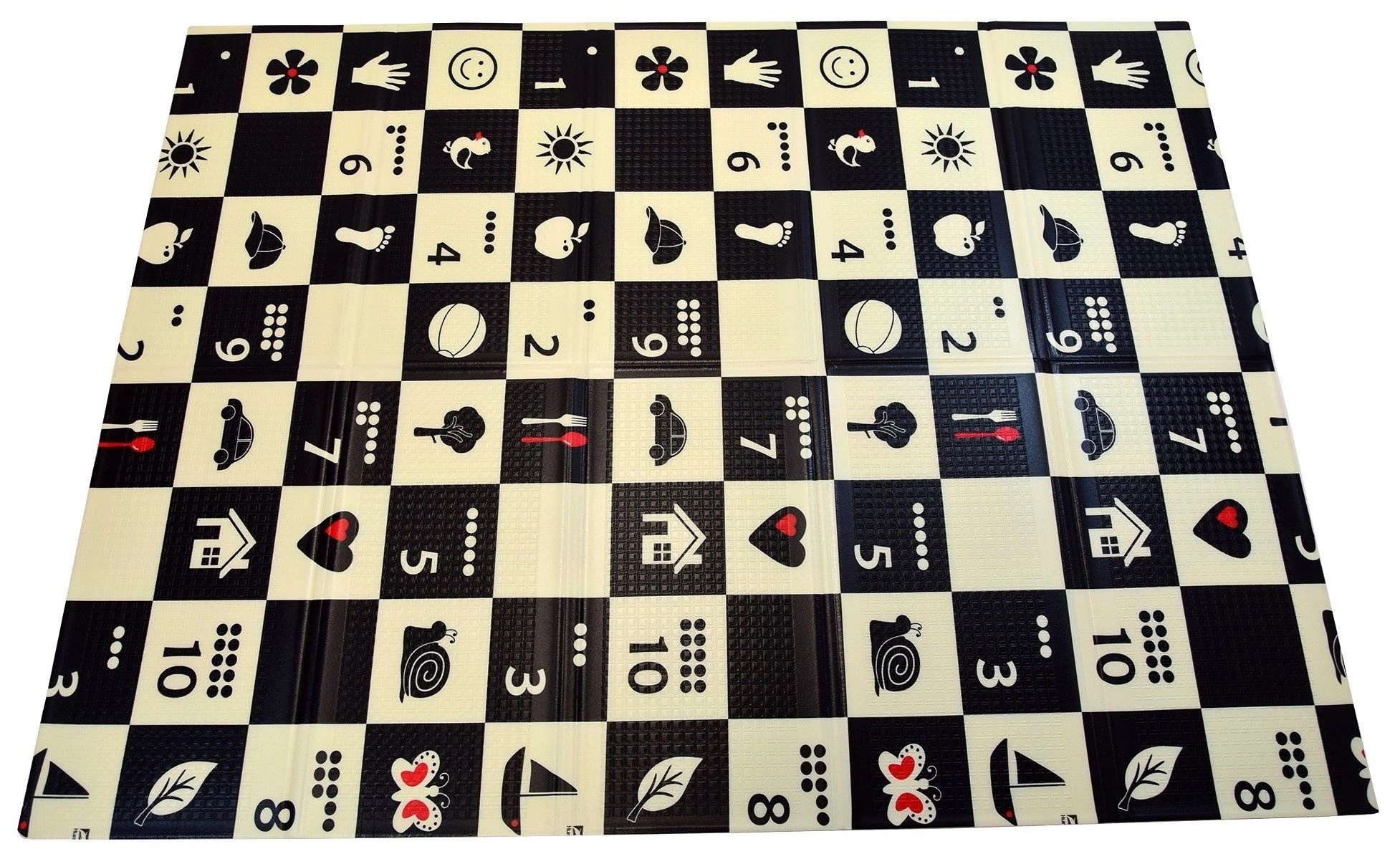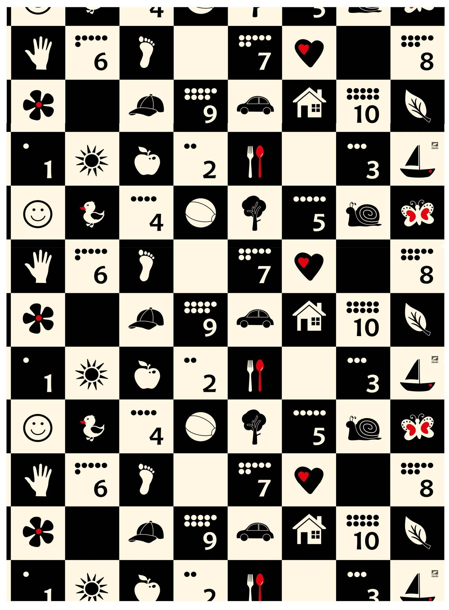 Het zwart-witte schaakbordpatroon met eenvoudige pictogrammen stimuleert het zicht, ondersteunt visueel-ruimtelijke intelligentie en trekt de aandacht van baby’s.